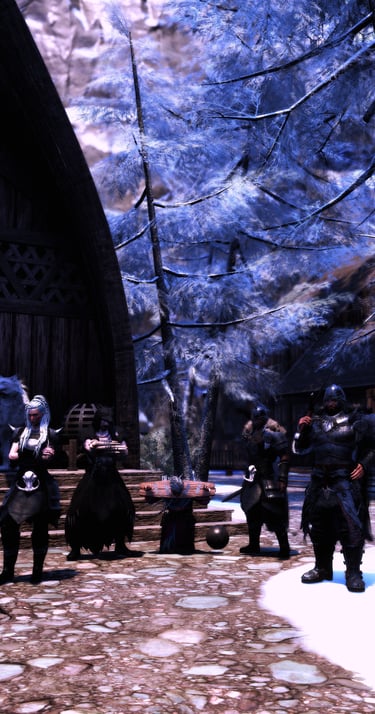 O dia começa antes do nascer do sol, com vigílias silenciosas e leitura dos sinais do vento. Não há luxo. Armas são simples, resistentes, feitas para sobreviver ao gelo. Armaduras são pesadas, forradas com peles e símbolos entalhados que representam os antigos pactos.